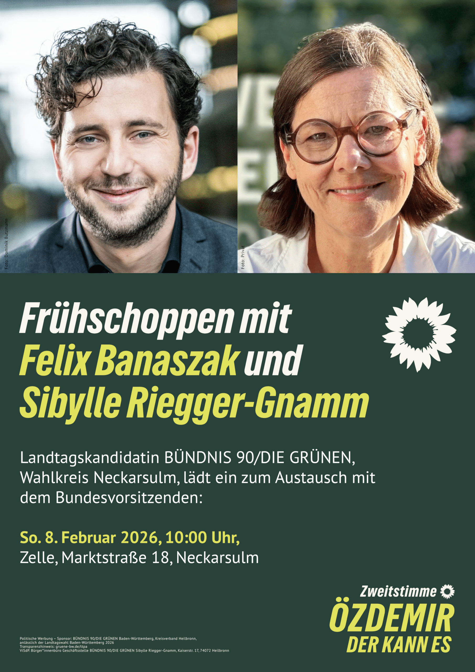 Heilbronn, 15. Januar 2026 – Am Sonntag, 8. Februar, lädt die Landtagskandidatin von BÜNDNIS 90/DIE GRÜNEN für den Wahlkreis Neckarsulm, Sibylle Riegger-Gnamm, zu einem Frühschoppen mit dem bündnisgrünen Bundesvorsitzenden Felix Banaszak ein. Die Veranstaltung findet ab 10 Uhr in der Zelle (Marktstraße 18, Neckarsulm) statt und bietet Bürger*innen die Gelegenheit, bei einem Getränk (mit oder ohne Alkohol) mit den beiden über zentrale politische Zukunftsfragen ins Gespräch zu kommen – sei es Klimaschutz und Energiewende, soziale Gerechtigkeit, bezahlbares Wohnen, Mobilität im ländlichen Raum oder Perspektiven für Regionen, die stark von der Automobilindustrie geprägt sind.