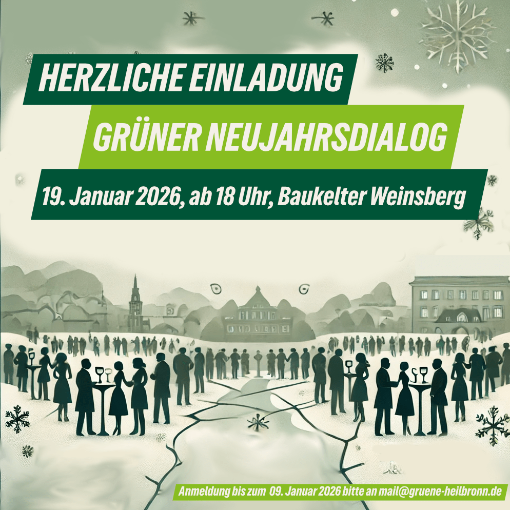 Jetzt schon einmal im Kalender markieren: Der grüne Neujahrsdialog des Kreisverbands Heilbronn findet am Montag, 19. Januar 2026, ab 18 Uhr in der Alten Kelter in Weinsberg statt.